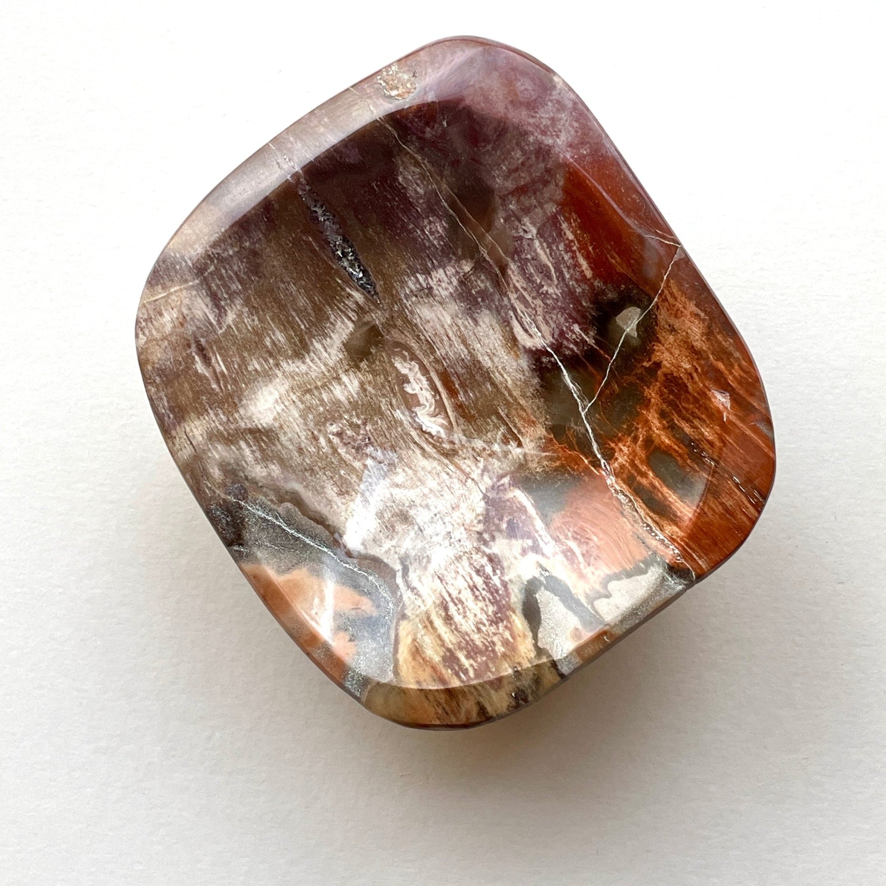 Handcrafted and polished in the USA from authentic Madagascar petrified wood. Each dish is one-of-a-kind—the specific combination of rust, umber, and mineral patterns cannot be replicated.