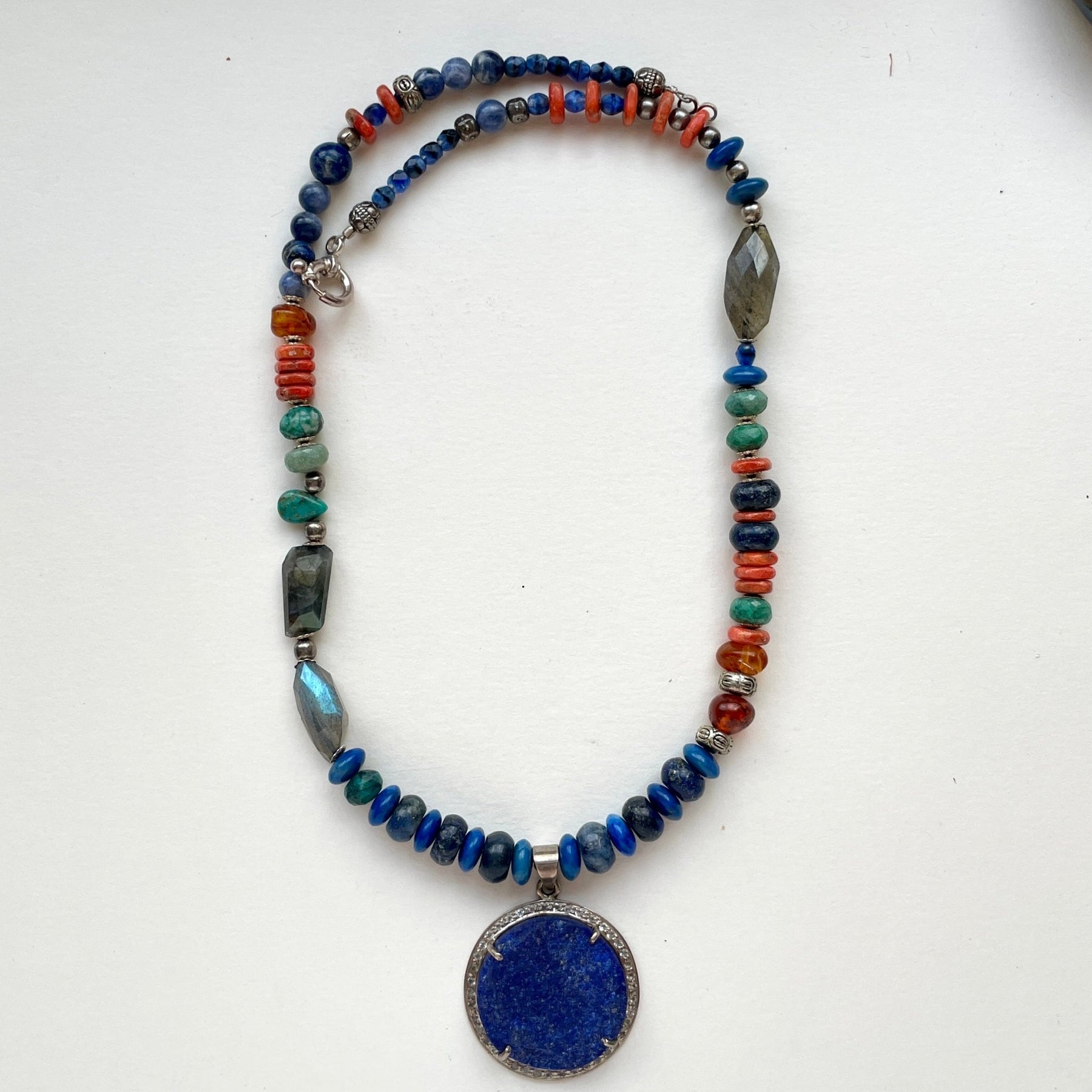 Each stone has been hand-cut and precisely placed to create a vibrant kaleidoscope of color. This intricate mosaic showcases the true skill of artisan inlay work, featuring turquoise, lapis lazuli, coral, jasper, spiny oyster shell, sugilite, and black onyx.