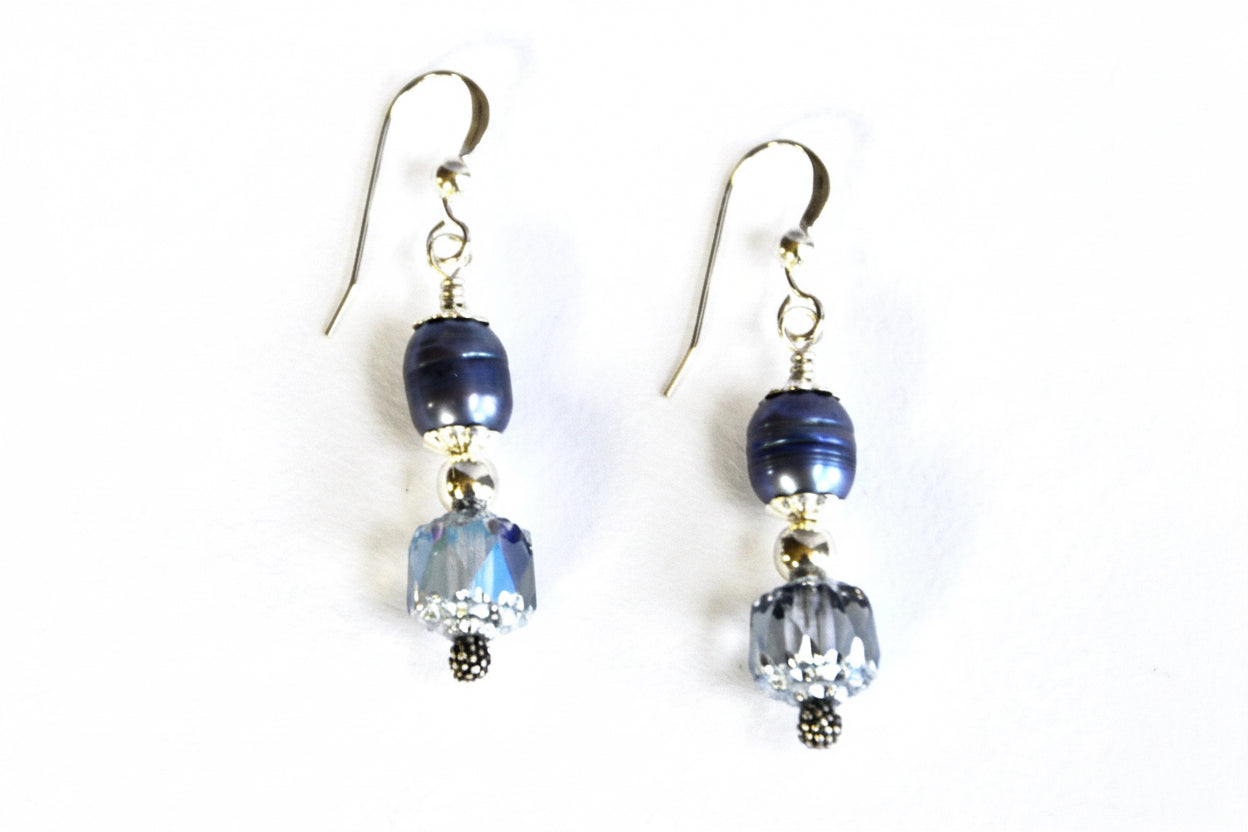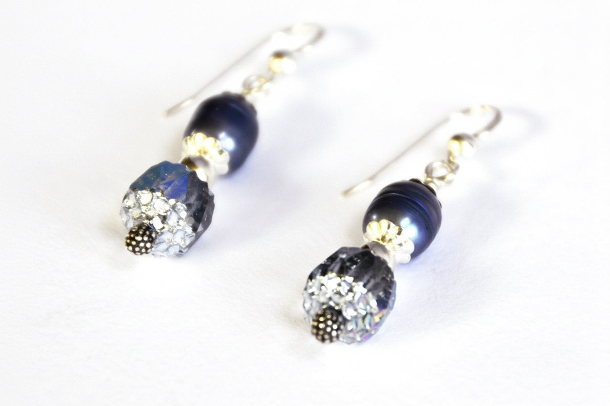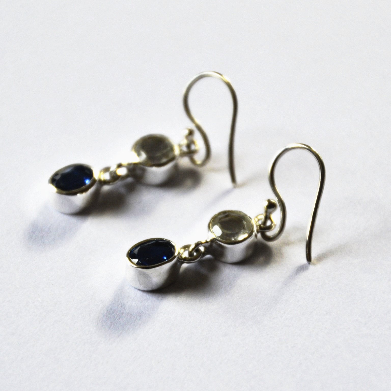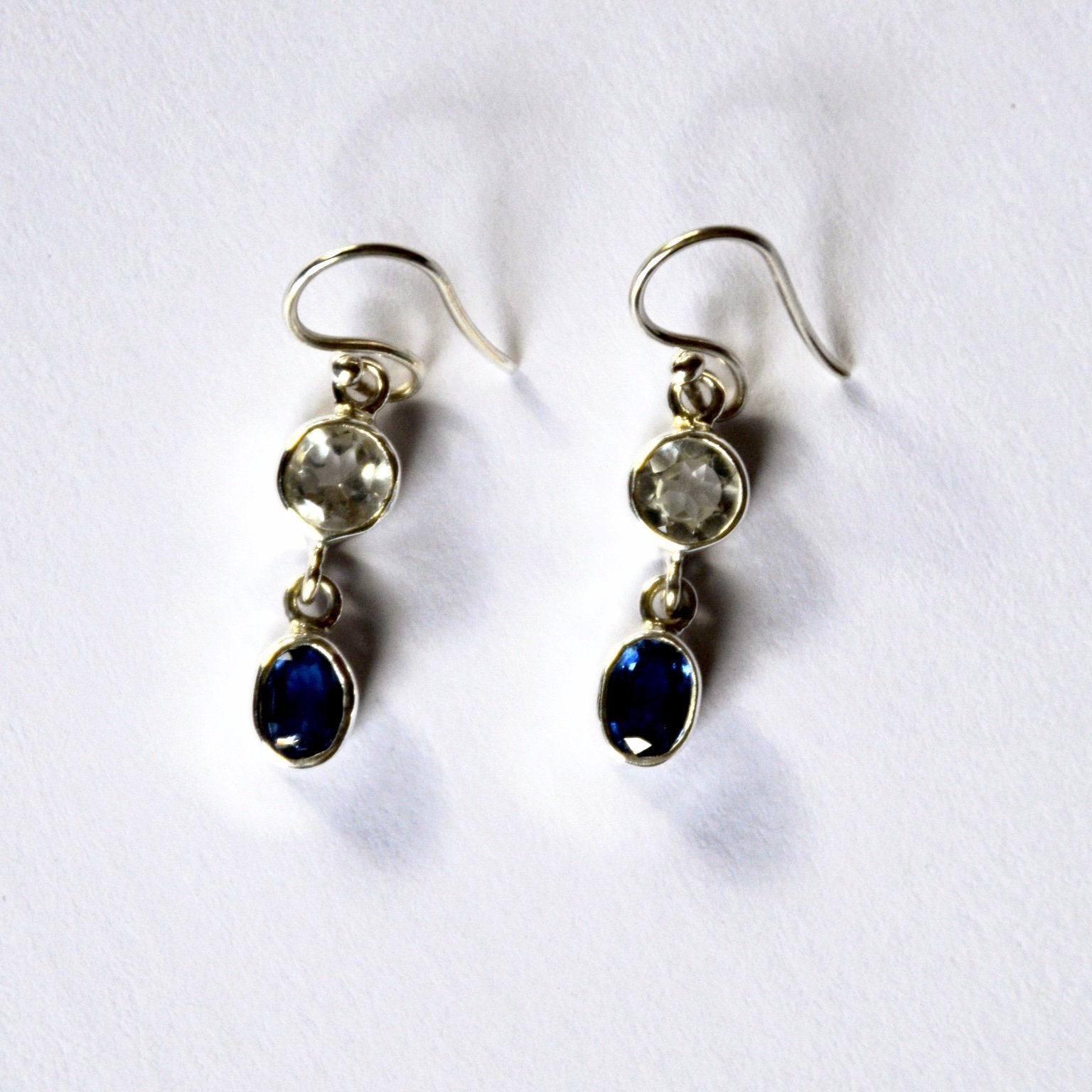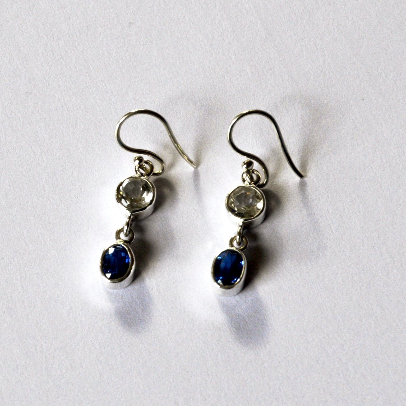 Deep blue faceted kyanite gemstones paired with sparkling white topaz create an elegant, icy sophistication in these handcrafted earrings. The rich sapphire-like blue of the kyanite contrasts beautifully with the diamond-like brilliance of the topaz, all set in sterling silver for a refined, delicate look.