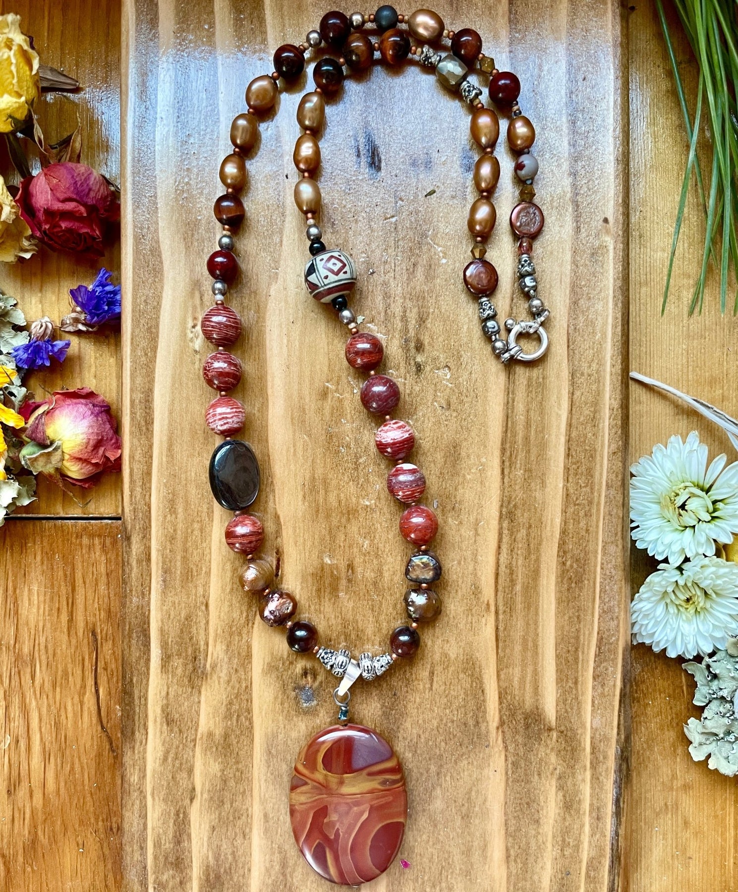 Red River jasper, tiger's eye, pietersite, carnelian, freshwater pearls, pyrite, vintage Peruvian pottery bead, sterling silver