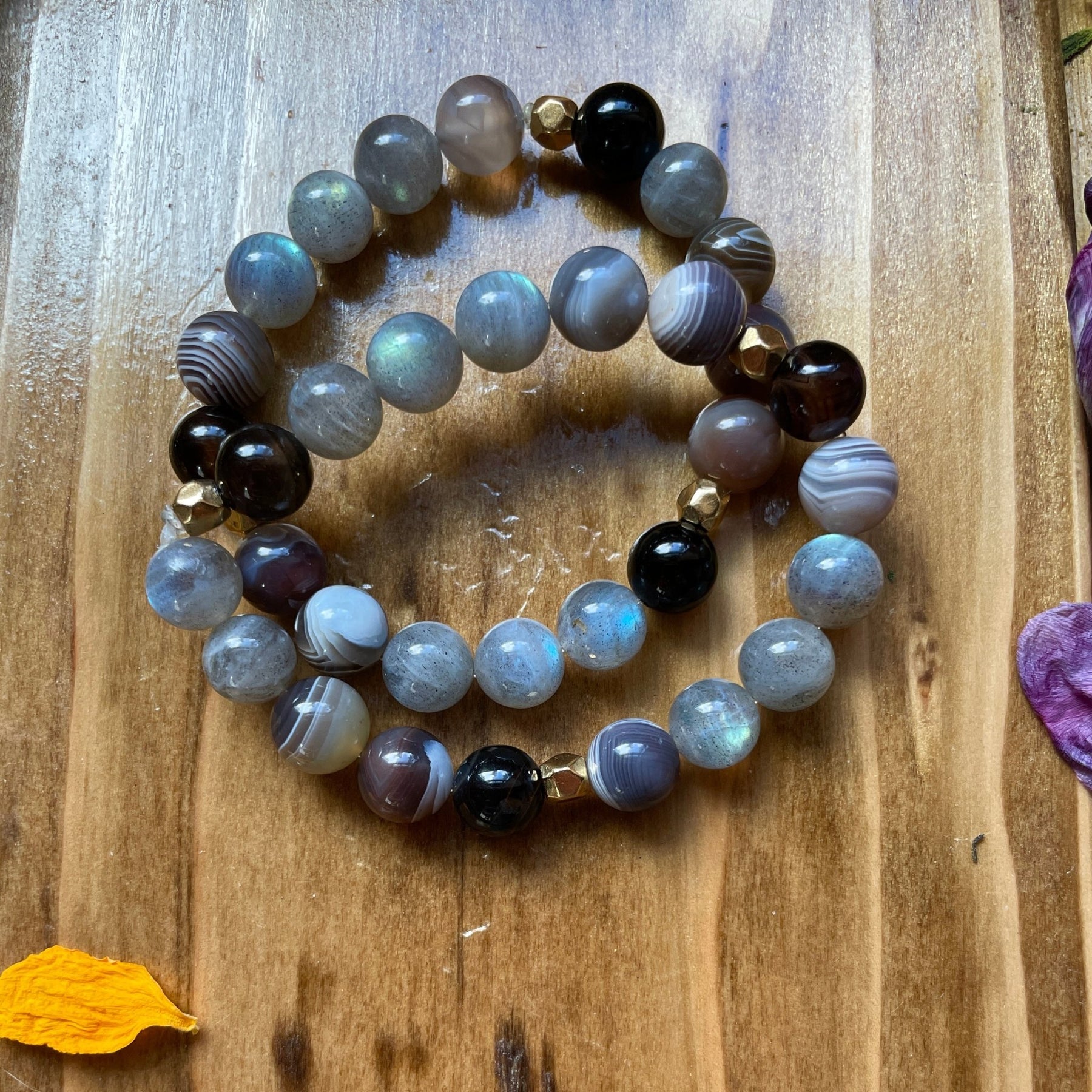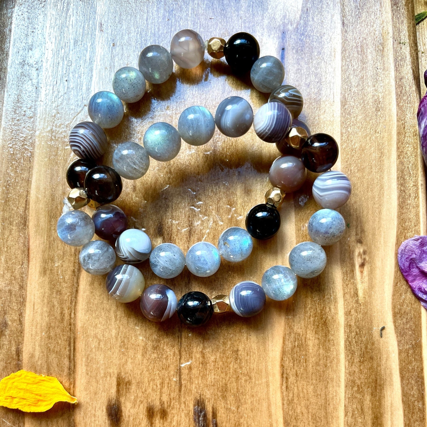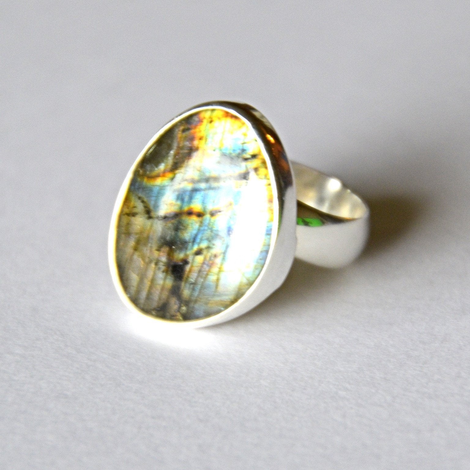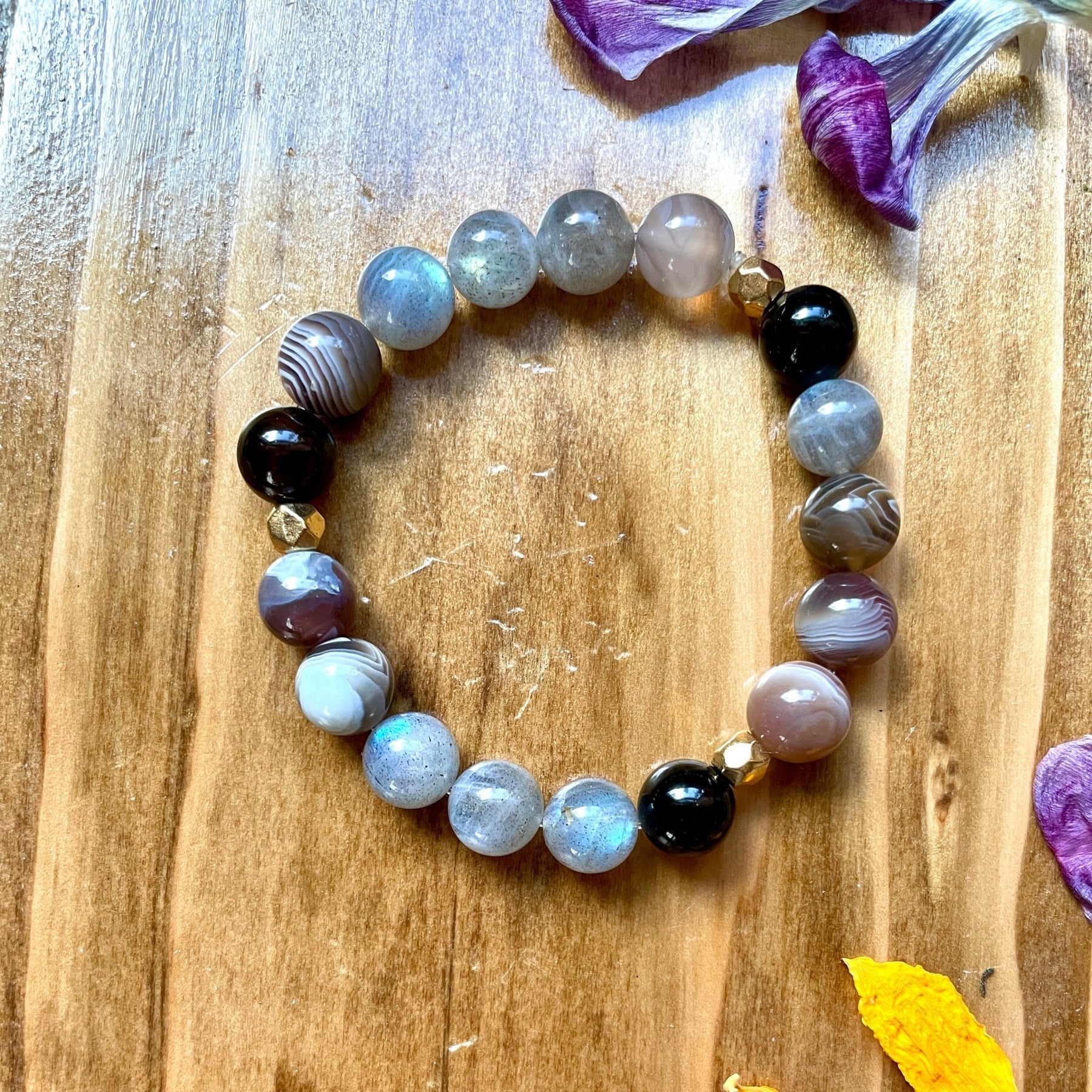 Mysterious Labradorite, faceted to sparkle, paired with hand hammered brass full moon and a large drop of rainbow moonstone.