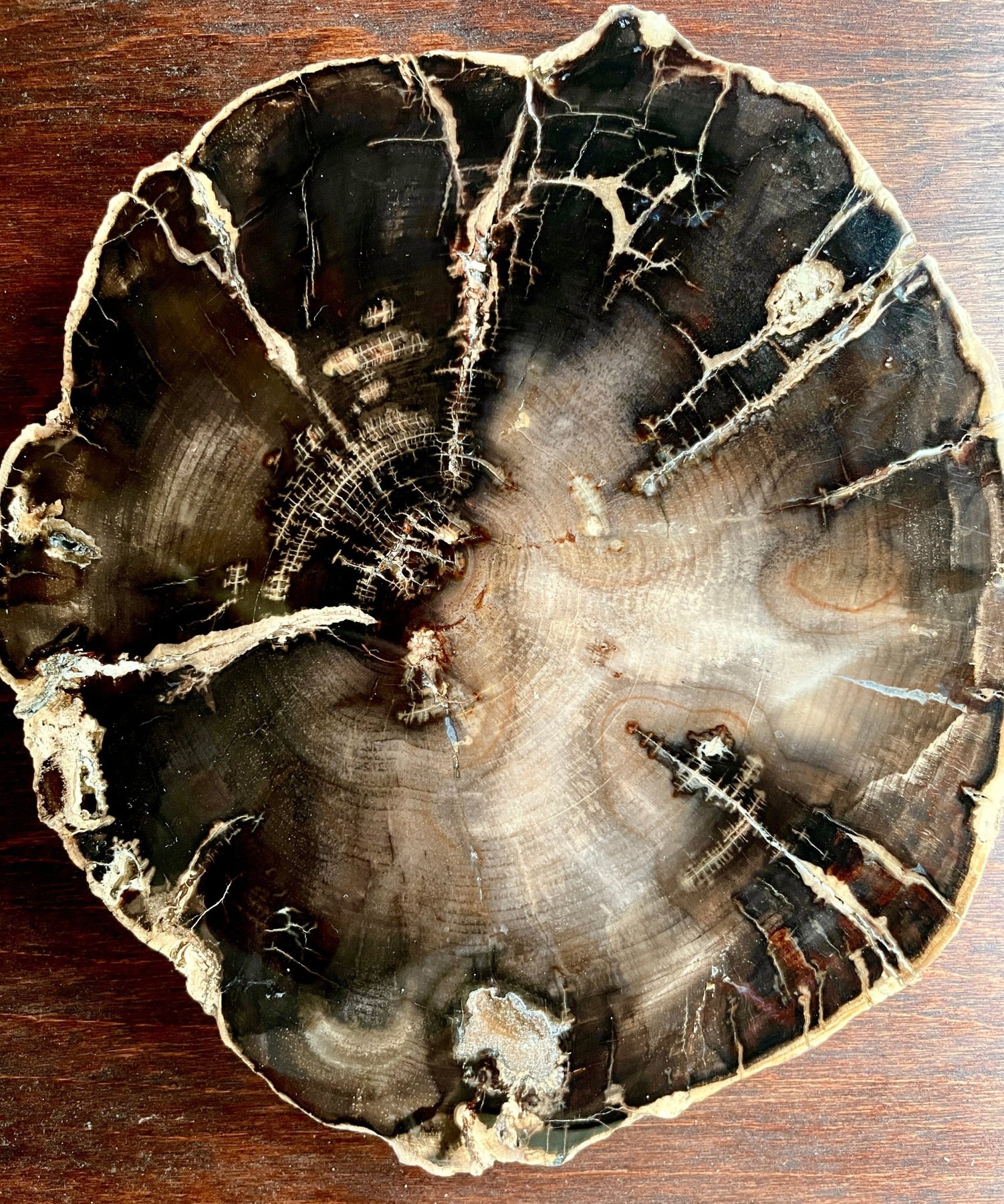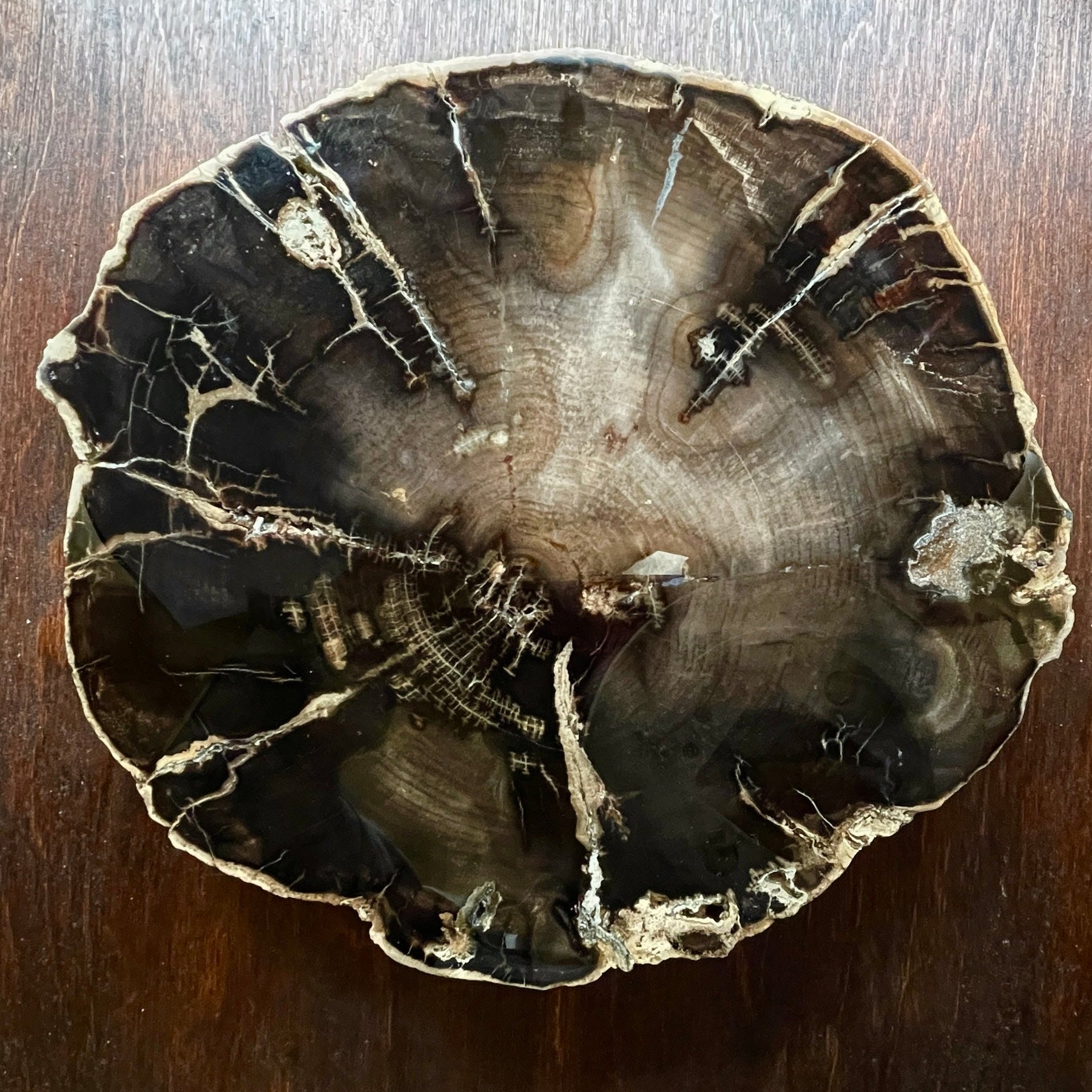 Rich brown slice of petrified cherry wood from Oregon. Authentic and collected ethically, this petrified wood slice shows deep browns to caramel wood tones, actual tree rings and inner cavities.