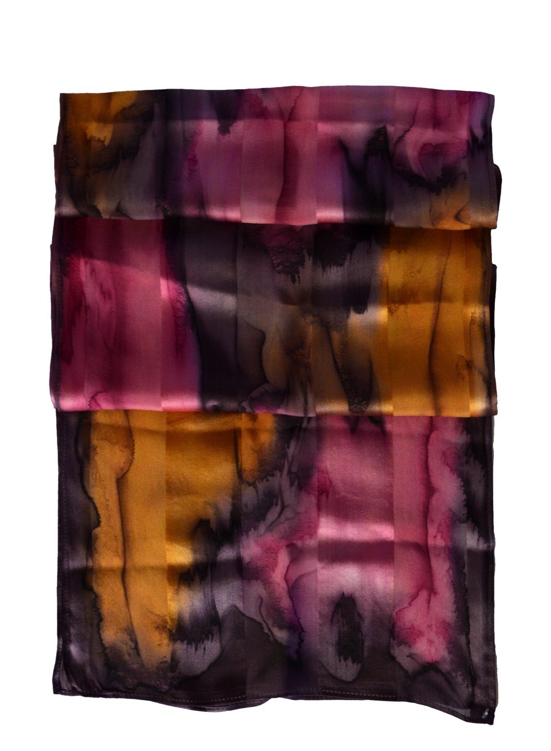 Dress up any outfit with Midnight Hues hand painted silk scarf. The lovely rich colors of magenta, midnight purple and gold are a subdued pop of color.