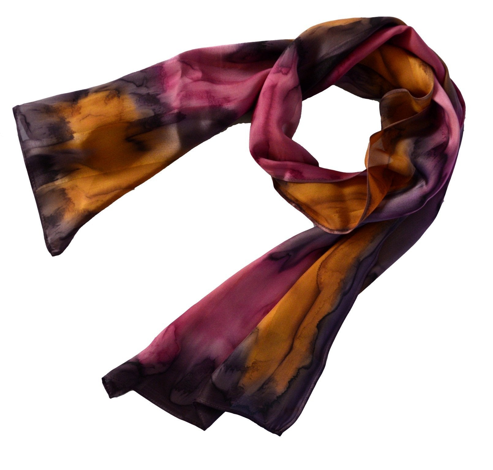 Deep purple, hints of midnight magentas and golden yellows. Midnight Hues Hand Painted Silk Scarf made in the USA.  Silk scarf may be Hand wash cold (no woolite please) or dry clean. Iron on low steam as needed. Tie this on your handbag for color, wear it as a headband or traditionally around your neck. Each scarf is a hand painted original and slight variations may occur. USA Artist.