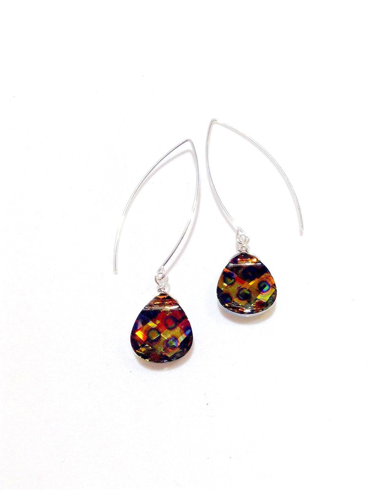 Expertly crafted with genuine Swarovski crystals, these earrings feature a colorful display of peacock-inspired hues including blue, gold, raspberry, and green. The elongated v-shaped sterling silver earwires add a touch of luxury to these exclusive USA artist-made earrings.