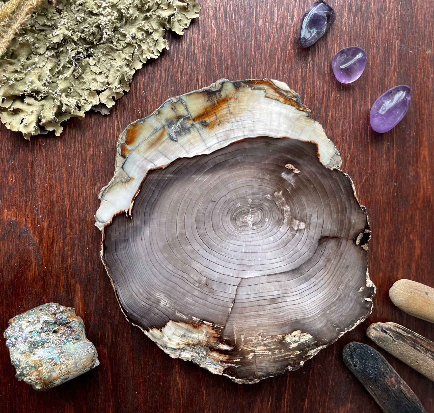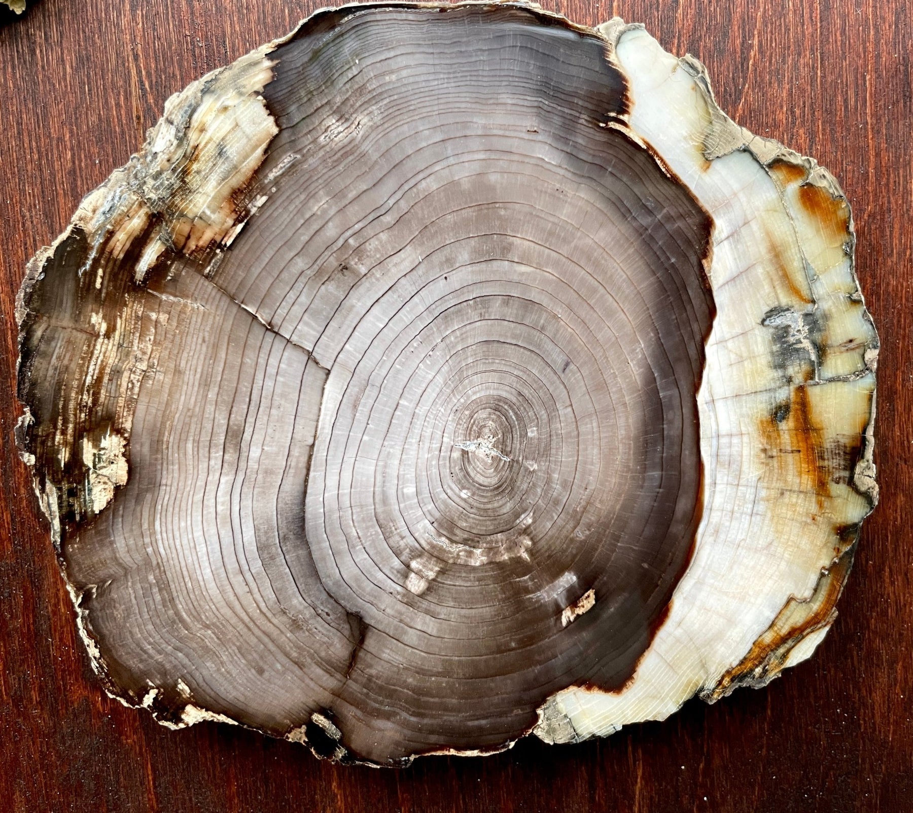 Ancient sequoia trees fell and were covered in ash or mud allowing minerals to soak through the wood. Instead of rotting the tree transforms into petrified wood! Sequoia Petrified Wood slice in caramel brown, charcoal gray, umber and creams.