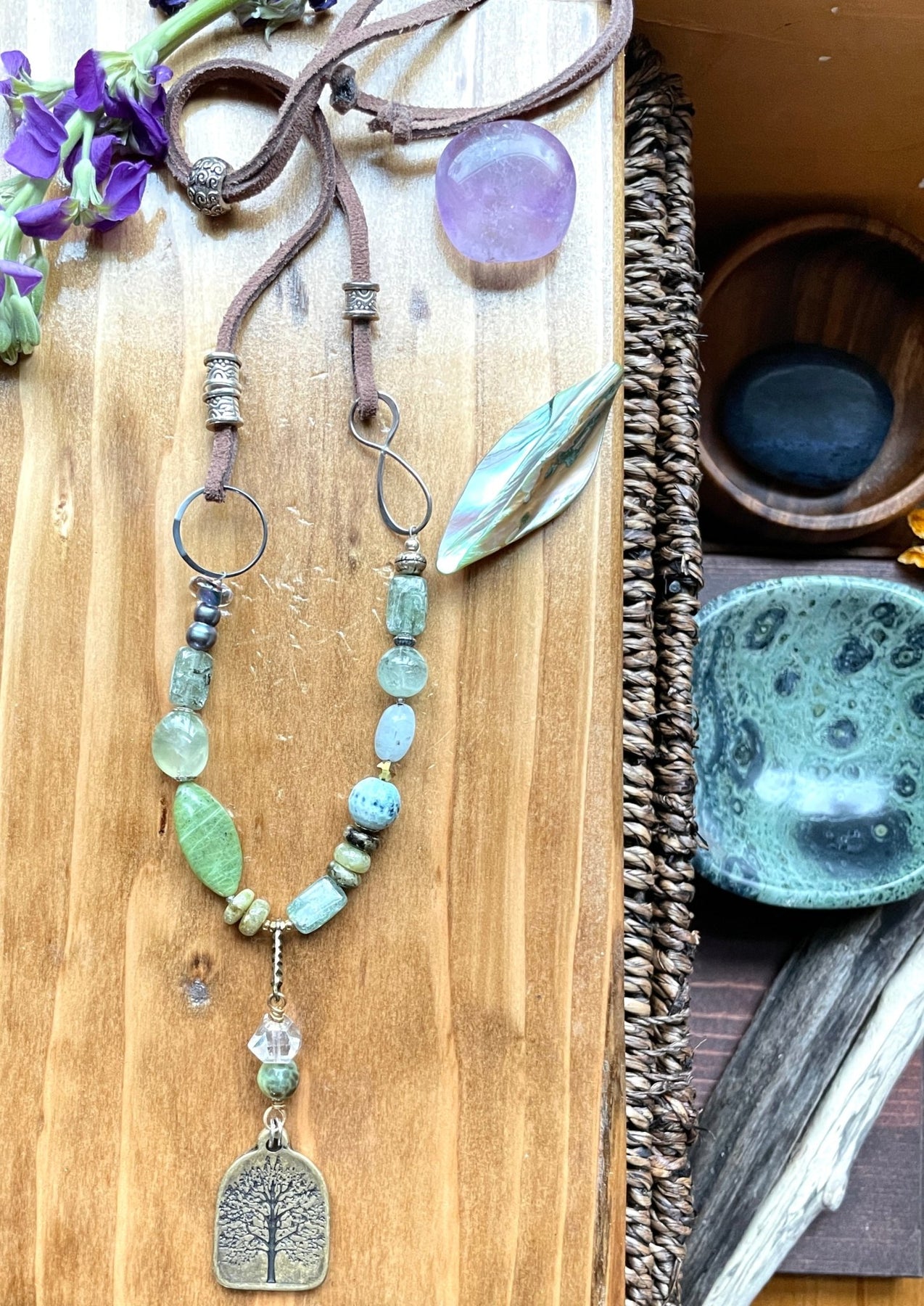 Materials: Green kyanite, jade, green quartz, brass tree pendant, leather cord, oxidized sterling silver elements
