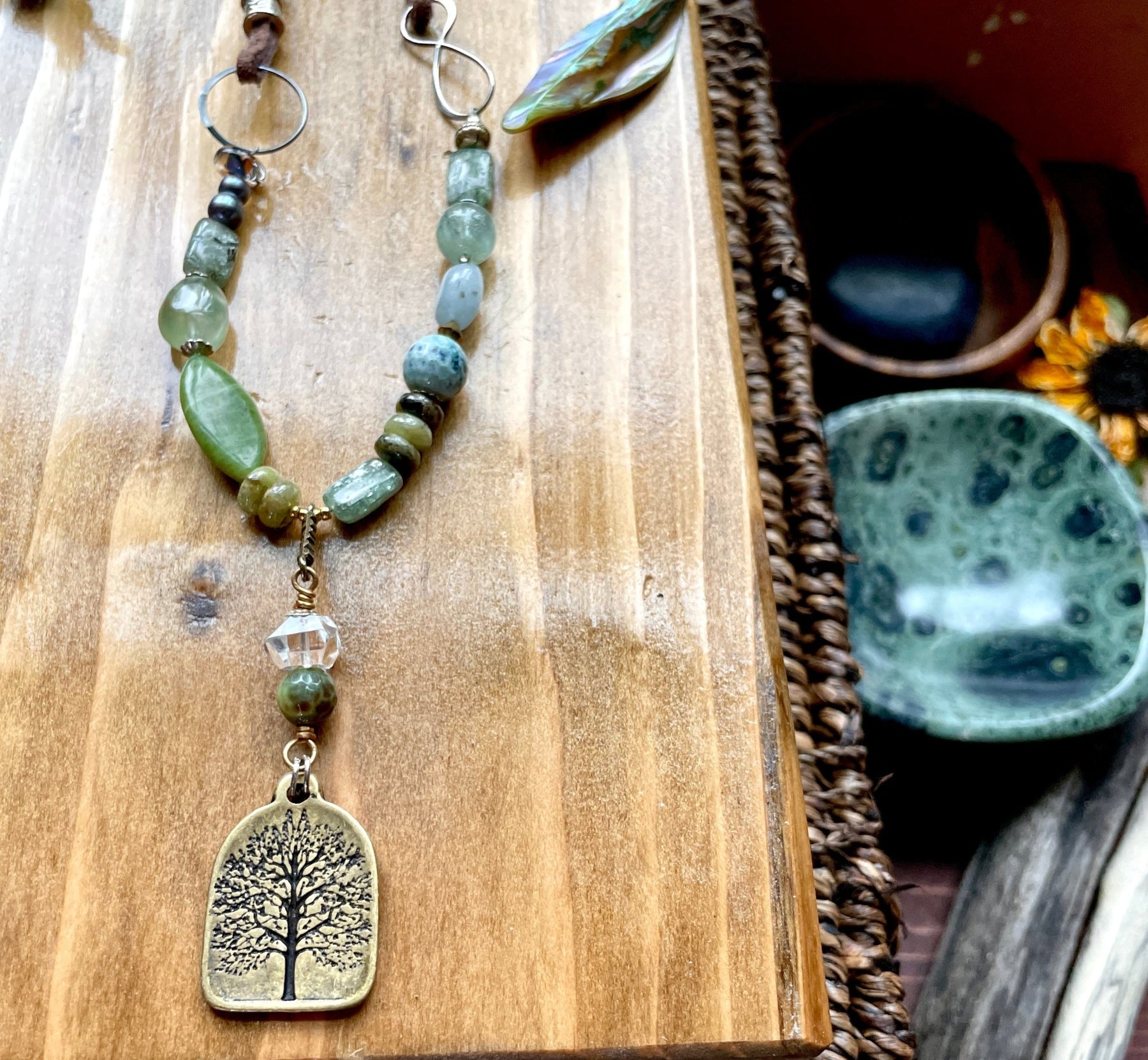 Regular price $98.00 USDThis handcrafted Tree of Life necklace embodies connection to all things—roots that run deep into the earth, branches reaching skyward, taking in energy and giving it back. The brass tree pendant is surrounded by shades of green kyanite, leaf green jade, clear green quartz, and complementary gemstones on a leather cord with oxidized sterling silver elements, creating a piece that connects you with your own strength and the natural world.