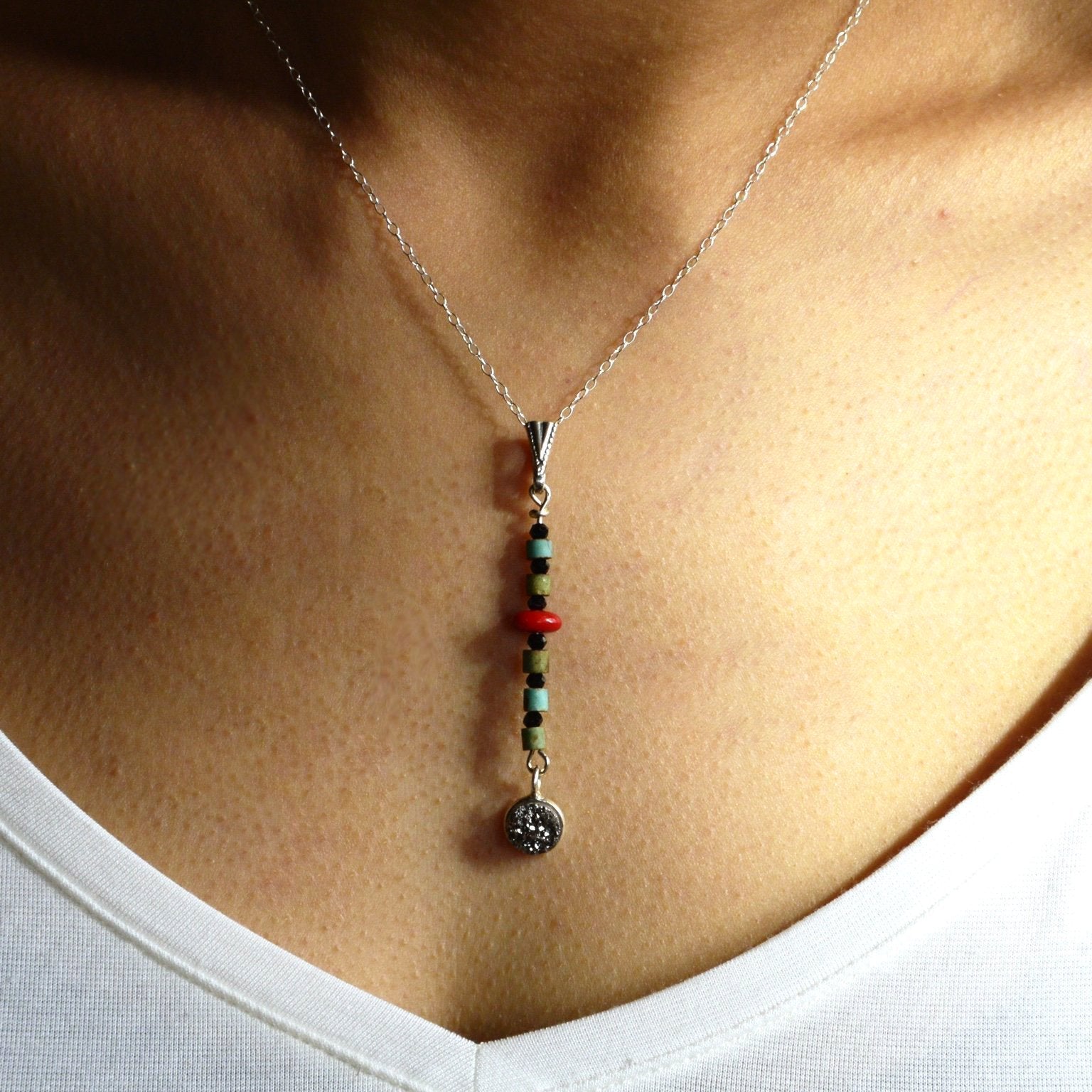 Turquoise beads with one red coral bead and a druzy crystal on bottom.