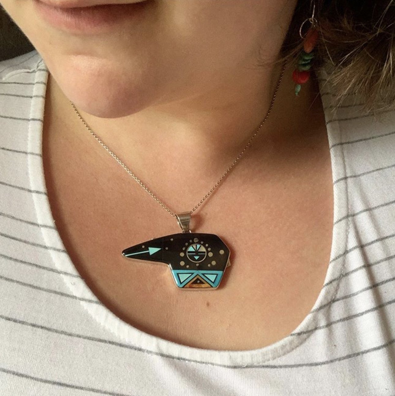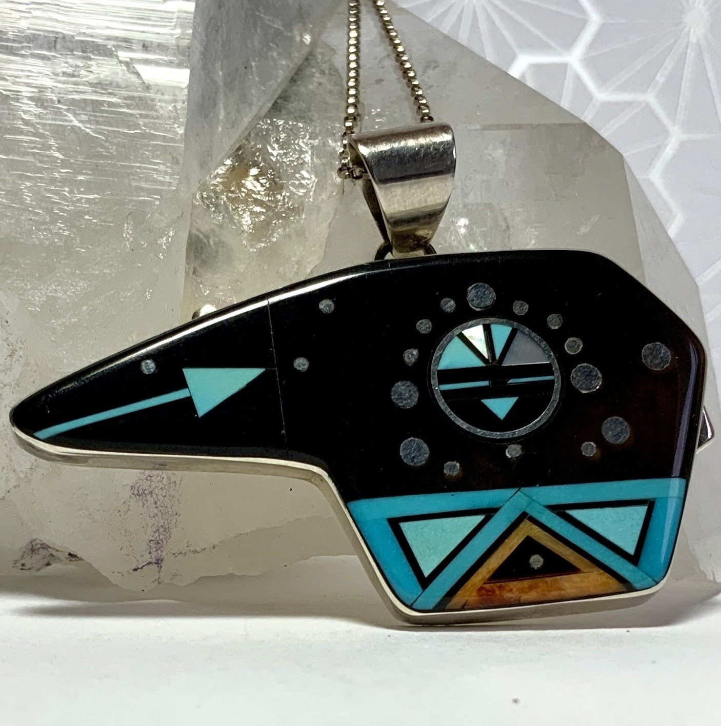 The Bear and the Kachina Spirit Inlay Pendant is a breathtaking work of wearable art that combines the powerful symbolism of the bear with the sacred imagery of Kachina spirits. This museum-quality piece showcases extraordinary inlay craftsmanship by a master artist with decades of experience.